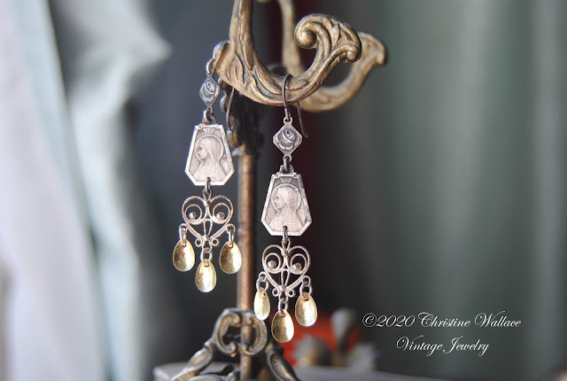 Hello and happy Sunday jewelry lovers!!! My new seven piece collection for this week debuting now and headed over to my Etsy shop in a little while. These unique seven pairs of earrings all feature gorgeous gemstone briolettes, antique French holy medals, vintage Danish wedding drops, and old art Deco rhinestones. A very sweet and spiritual collection, and, as of blog publishing time, all are still available...